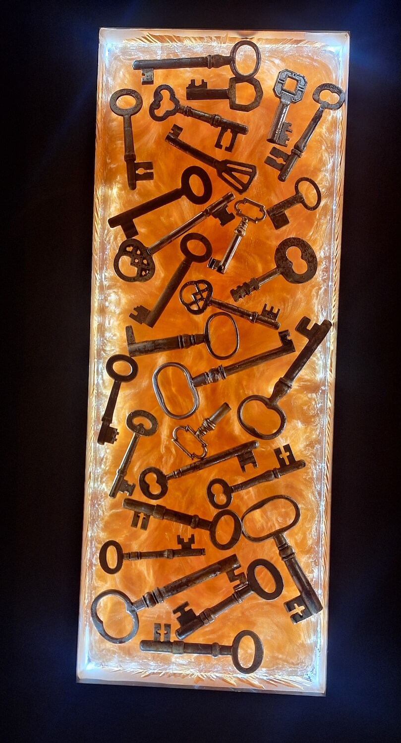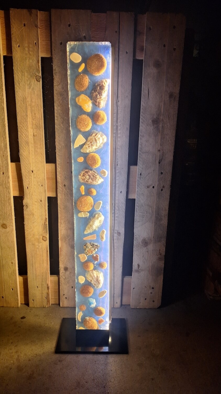stelen dienten im altertum als wegmarken, gedenktafeln, zur huldigung des herrschers. meine stelen bestehen aus muscheln, blumen, steinen, sand, stahlwolle oder was immer sie wünschen. eingegossen in epoxi harz entstehen zeitlose, speziell beleuchtbare objekte.